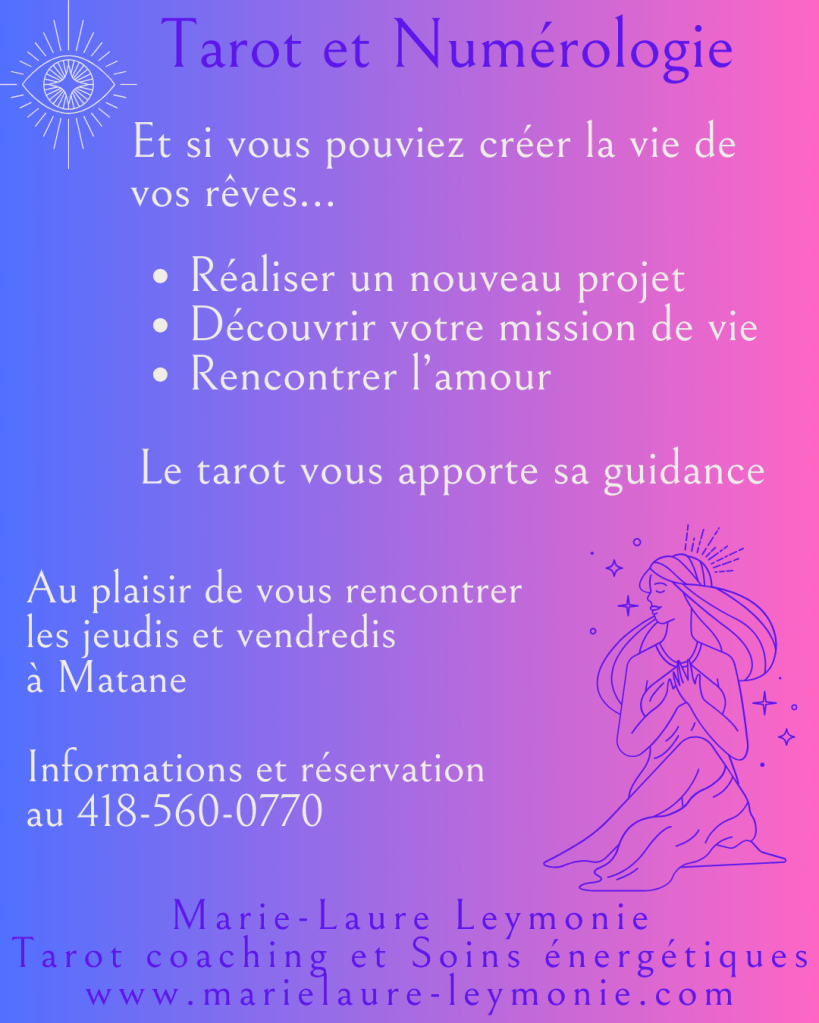 C’est avec grand plaisir que je peux désormais vous rencontrer deux jours par semaine à Matane. En mode coaching, le Tarot vous apportera sa guidance bienveillante.