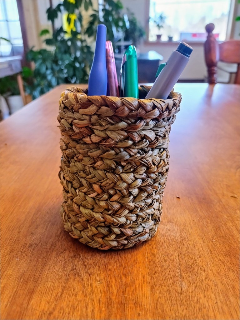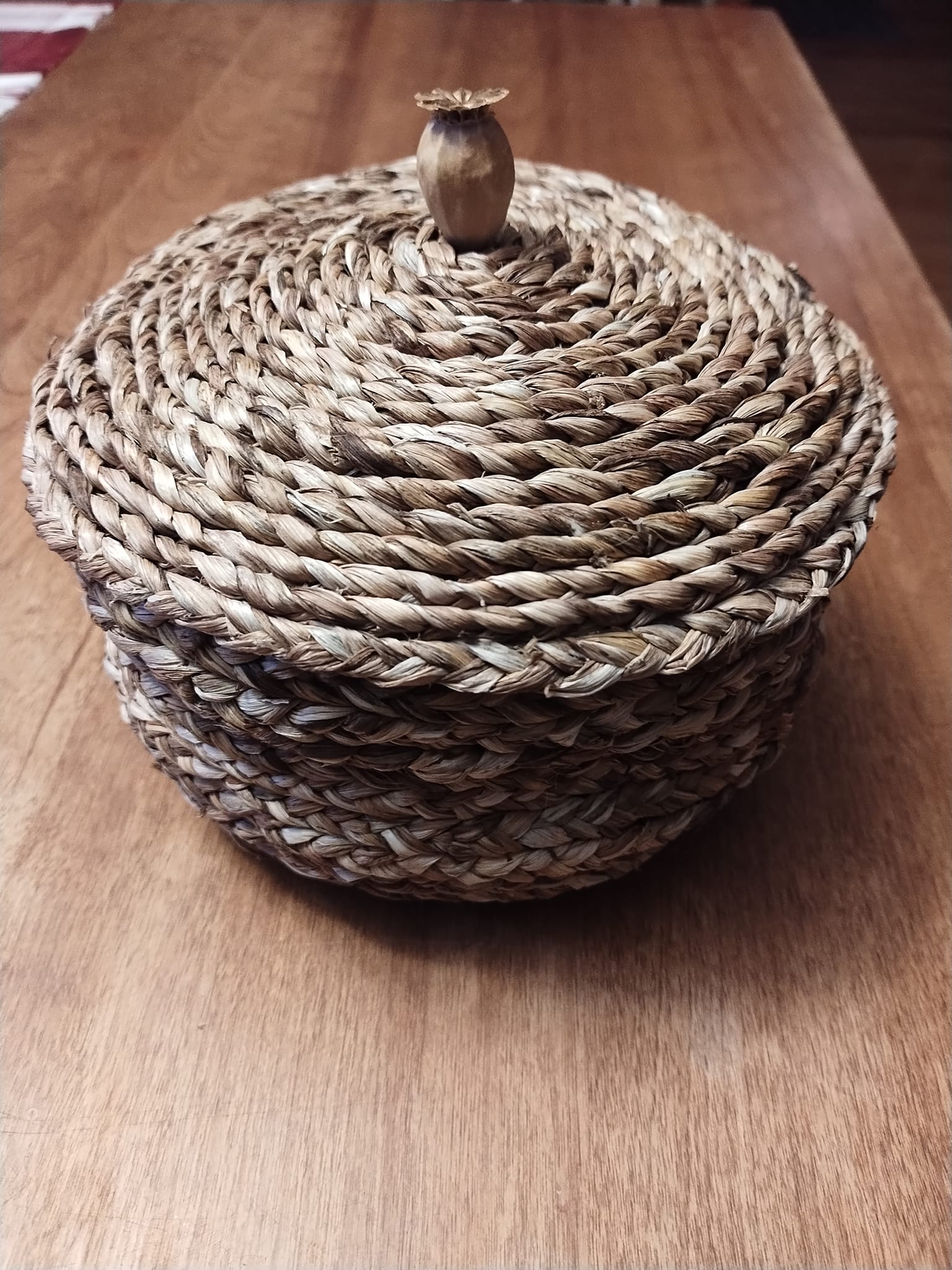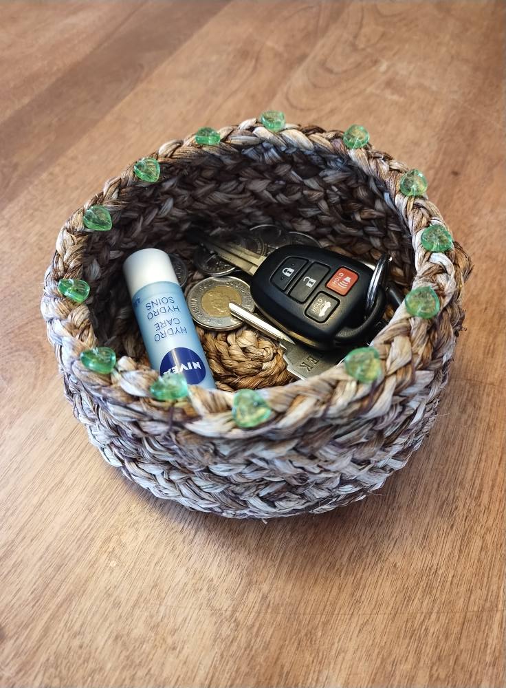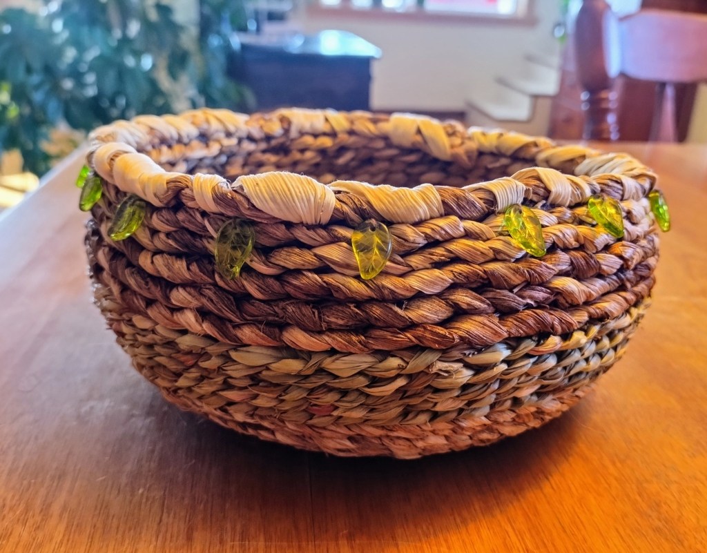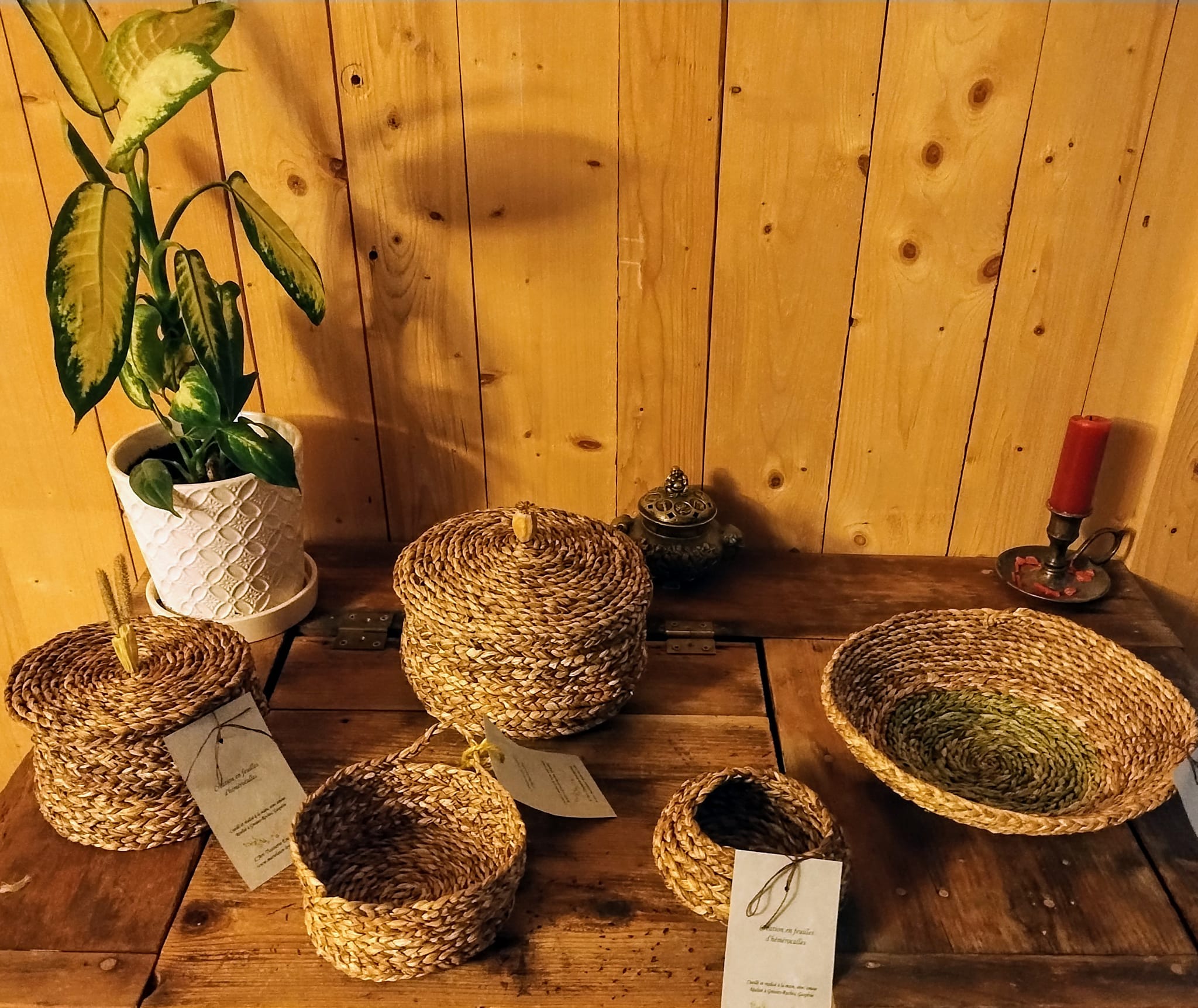 Objets décoratifs, corbeille, petit pot, mobile, principalement en feuilles d’hémérocalles (cueillies à l’automne en Matanie) tressées et cousues. Chaque pièce est unique. Les prix varient de 35$ à 120$.