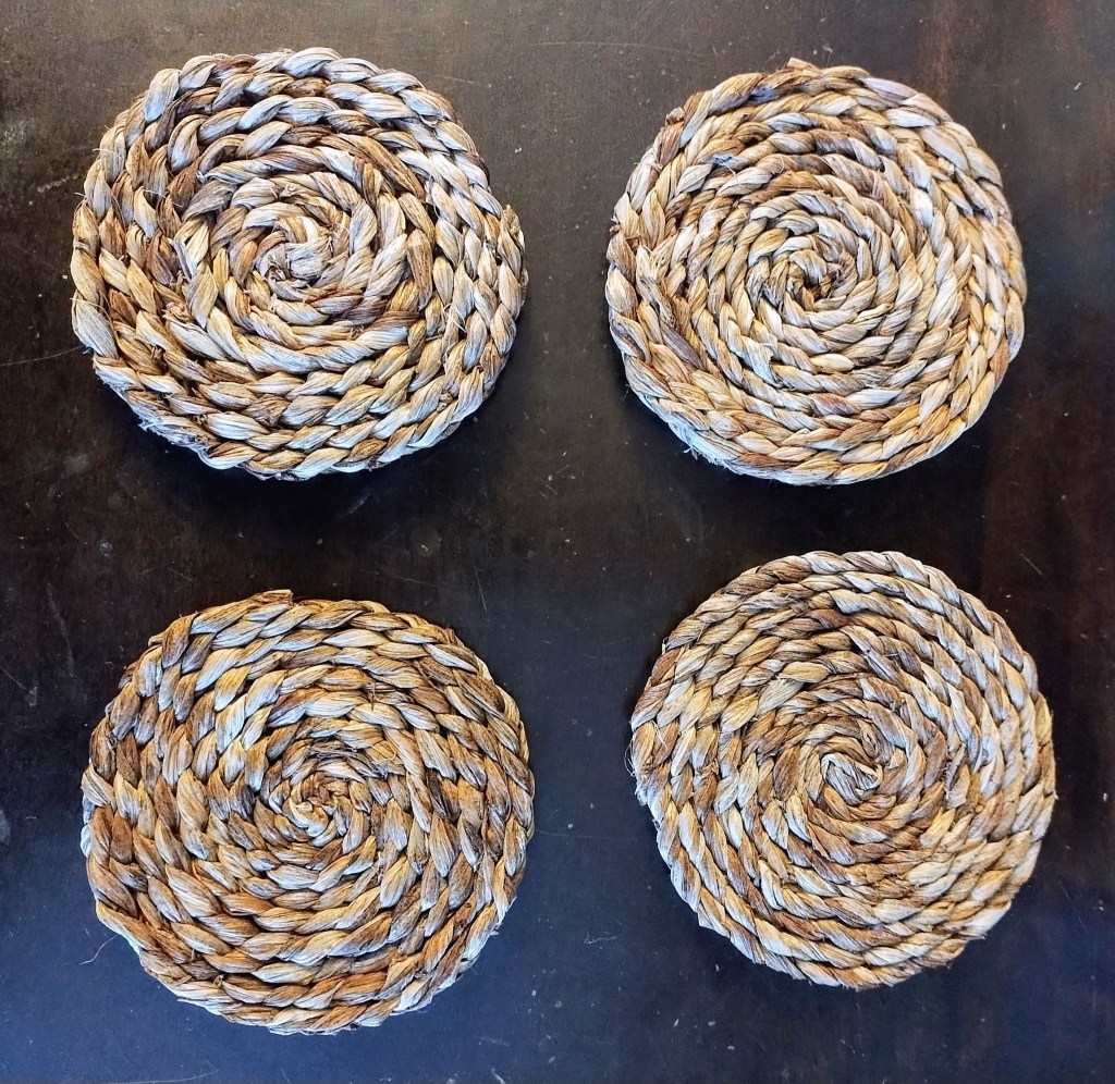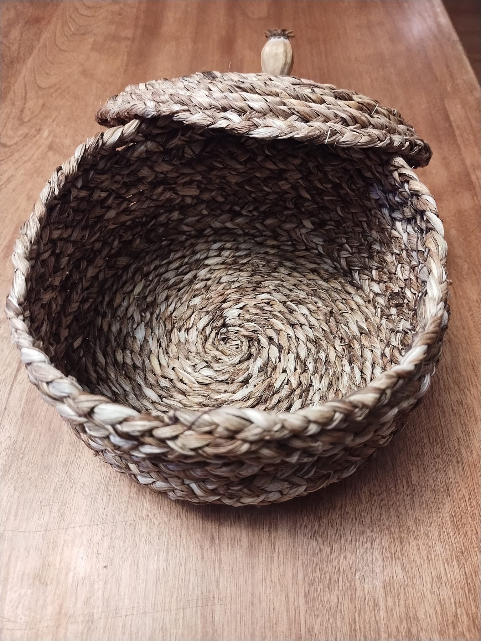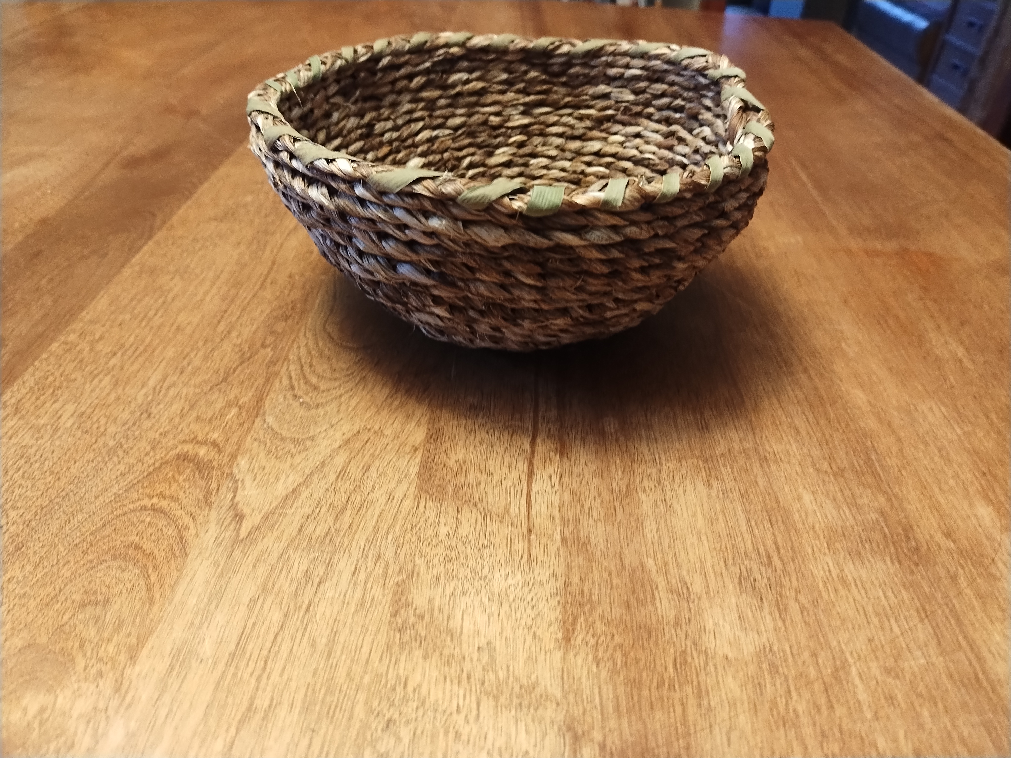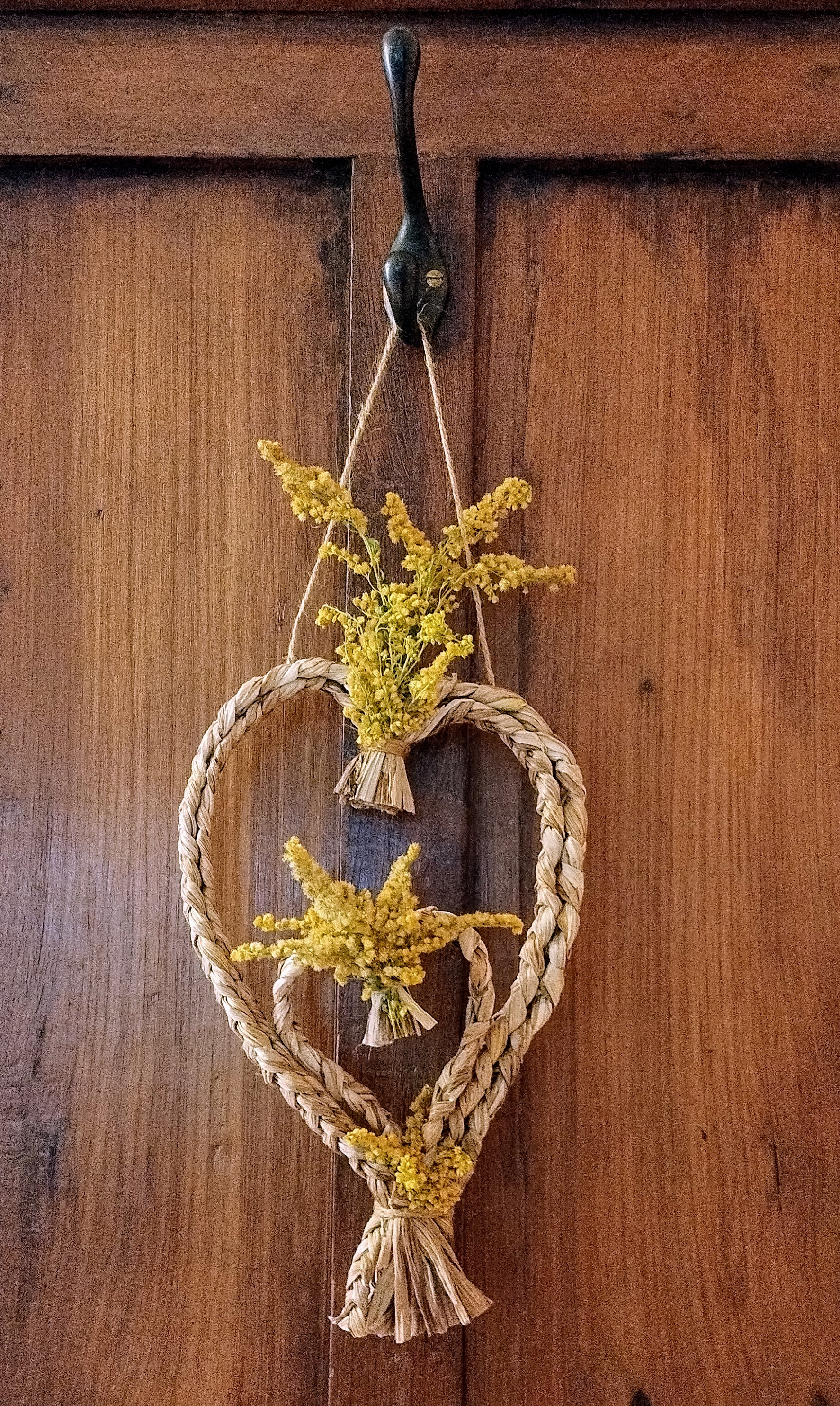 Objets décoratifs, corbeille, petit pot, mobile, principalement en feuilles d’hémérocalles (cueillies à l’automne en Matanie) tressées et cousues. Chaque pièce est unique. Les prix varient de 35$ à 120$.